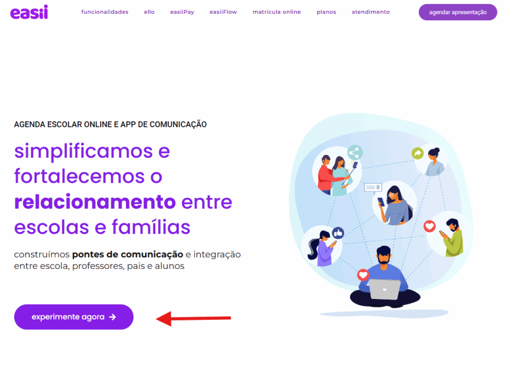 Para realizar o cadastro de uma conta de teste no easii, você deverá realizar o cadastro em nosso site através do endereço https://www.easii.com.br, e logo em seguida encontrar e clicar no botão “EXPERIMENTE AGORA”: