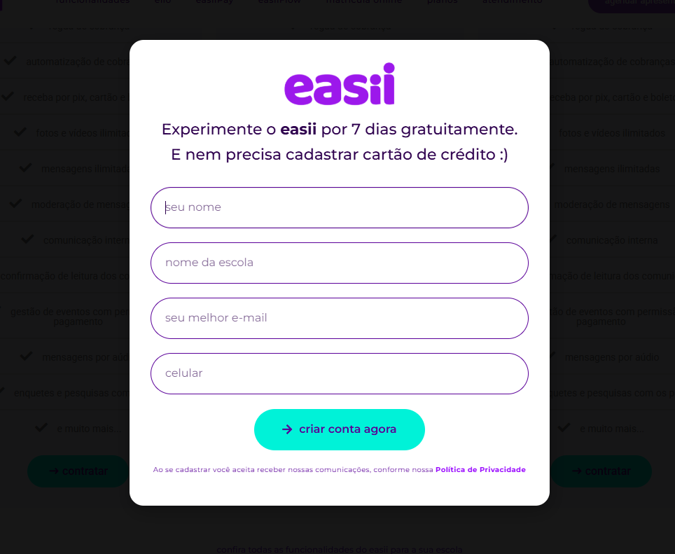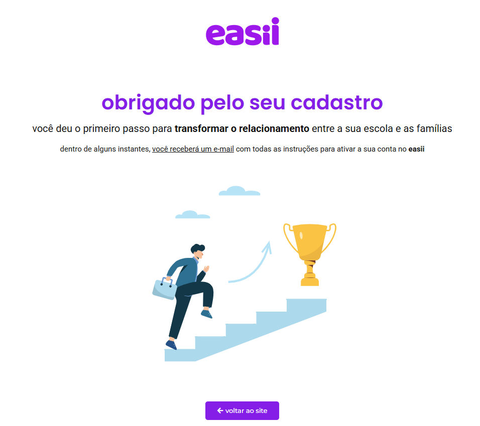 Agora, após receber o email de ativação e efetivá-la, você receberá os dados de acesso para experimentar o easii por 7 dias gratuitamente, sem a necessidade de informar qualquer informação de pagamento ou cartão de crédito.