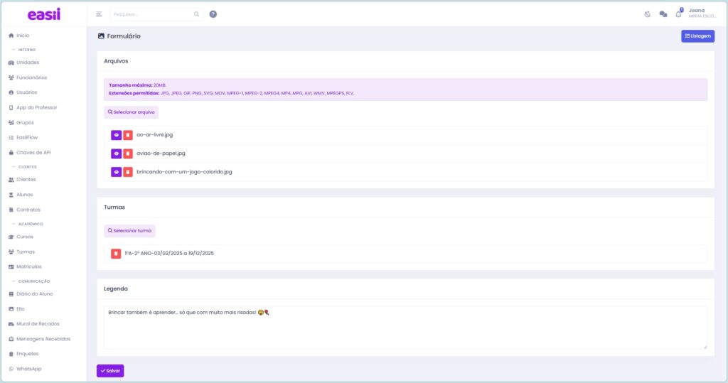Importante: somente os responsáveis com filhos nessa turma terão acesso à postagem, garantindo segurança e privacidade.