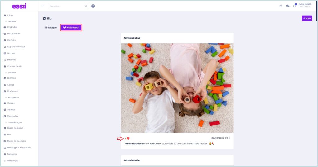 Simples: no ambiente administrativo (ou no perfil do professor), a escola também pode ver tudo o que foi publicado — igualzinho ao que os responsáveis veem. Para isso, é só acessar a aba “Visão Geral” da tela Ello.